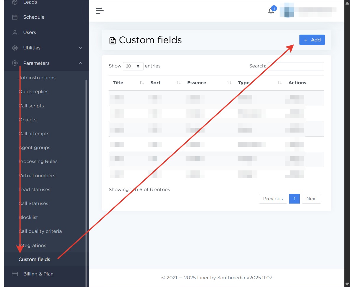 To create a custom field, open Parameters → Custom fields in the left panel, then click Add.