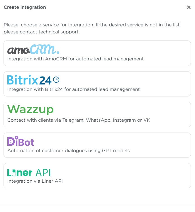 This integration allows you to send leads from Liner to AmoCRM, with options for assigning responsible users and mapping fields.