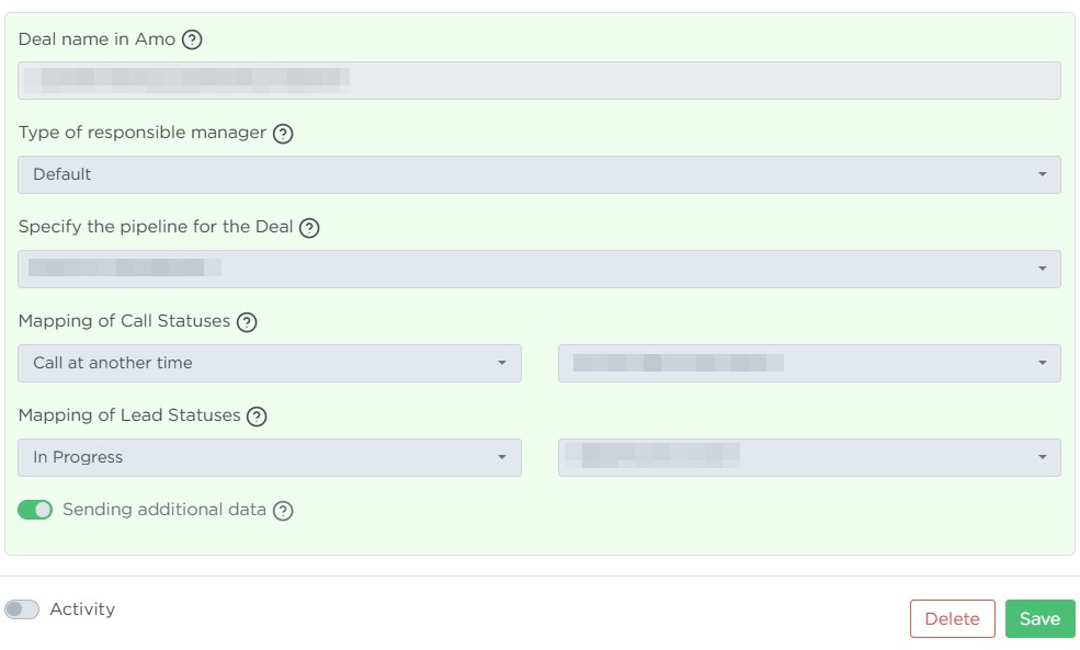 Mapping of Call Statuses — choose a Liner call status to send to a corresponding Amo status.