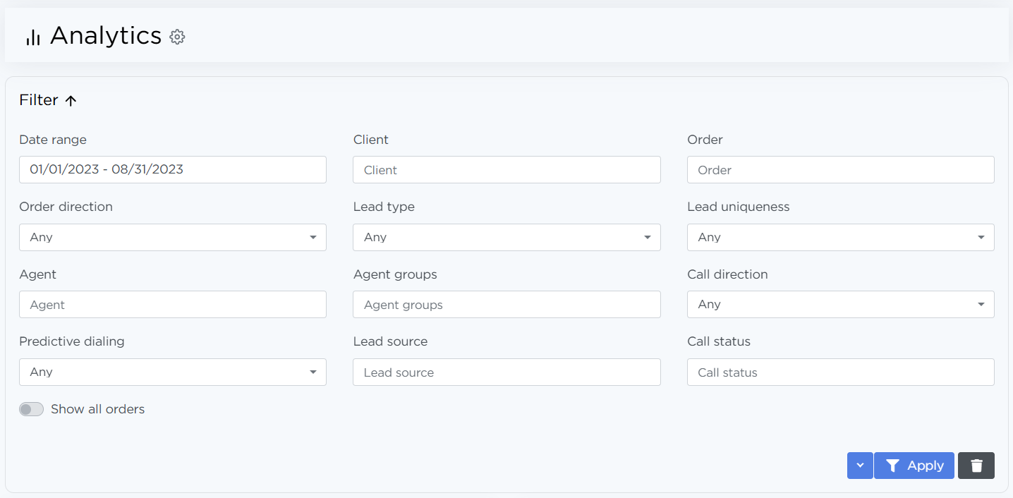At the top of the page, there is a Filter block. It allows you to narrow down data by date range, orders, lead types, and other parameters.