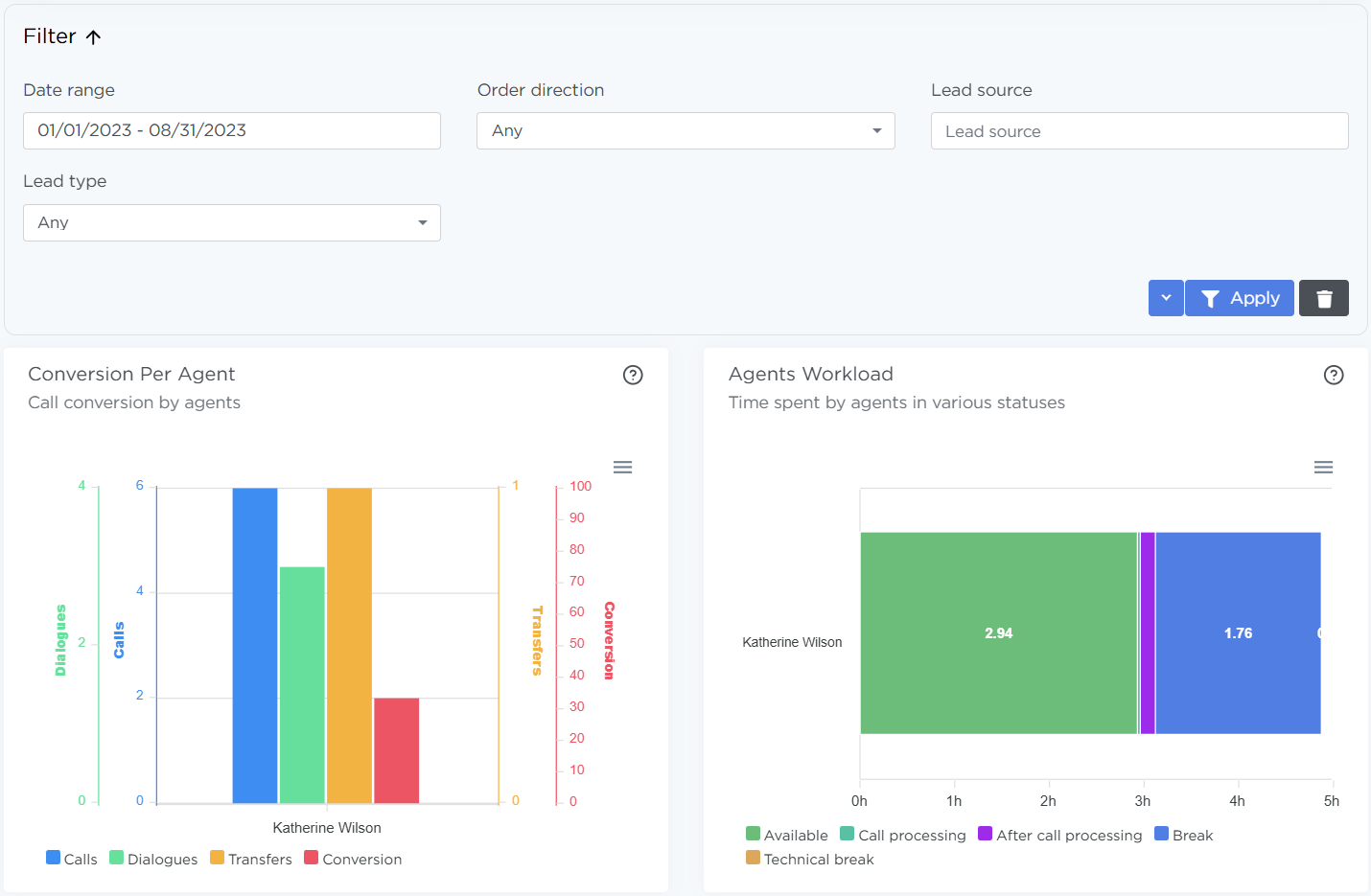Shows how an agent’s working time was distributed across different statuses. It helps assess actual workload during a day or selected period.