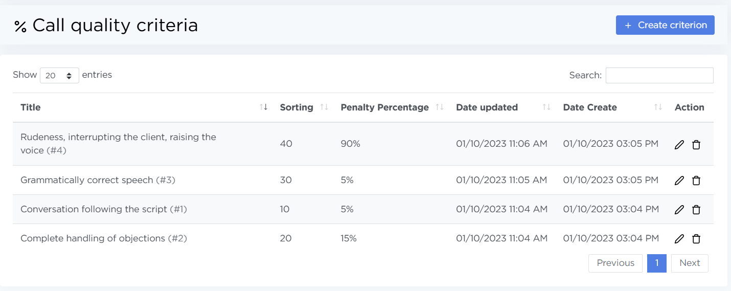 The Parametres → Call Quality Criteria page is used to manage the list of criteria that moderators use to evaluate calls. This page is where the criteria themselves are configured — their names, order, and penalty percentage — not the evaluation results.