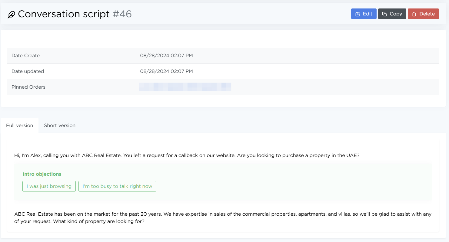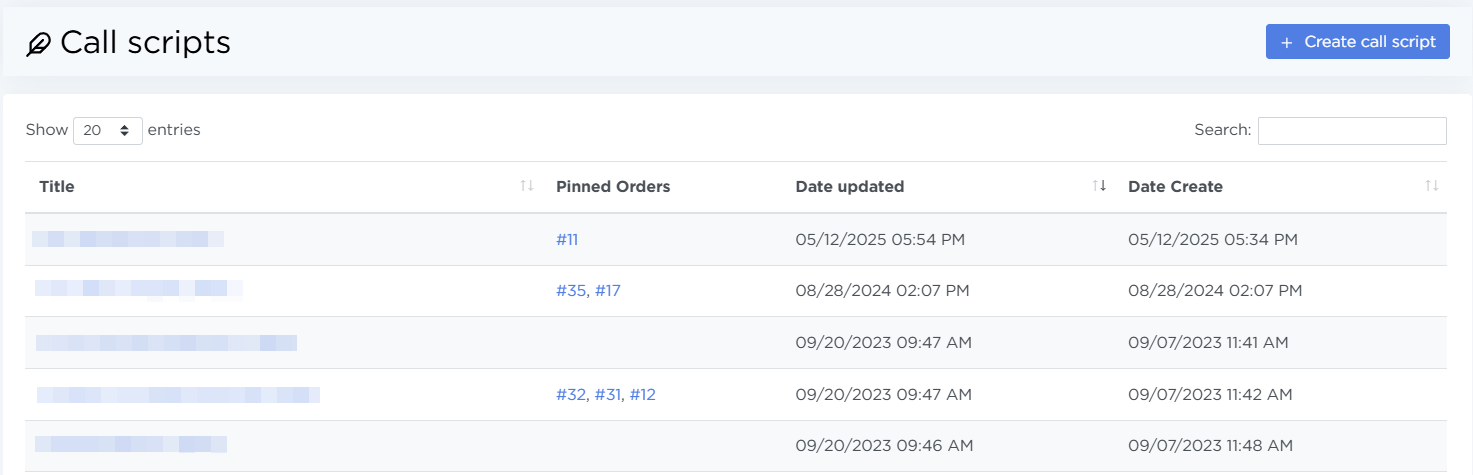 A call script is a structured set of prompts and texts that an agent sees during a call. One script can be used in multiple orders, so there’s no need to duplicate the same content.