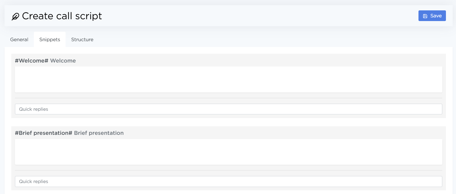 Quick replies are pre-written prompts for agents, such as objection handling or answers to common questions. They’re created separately and then attached to specific script blocks.