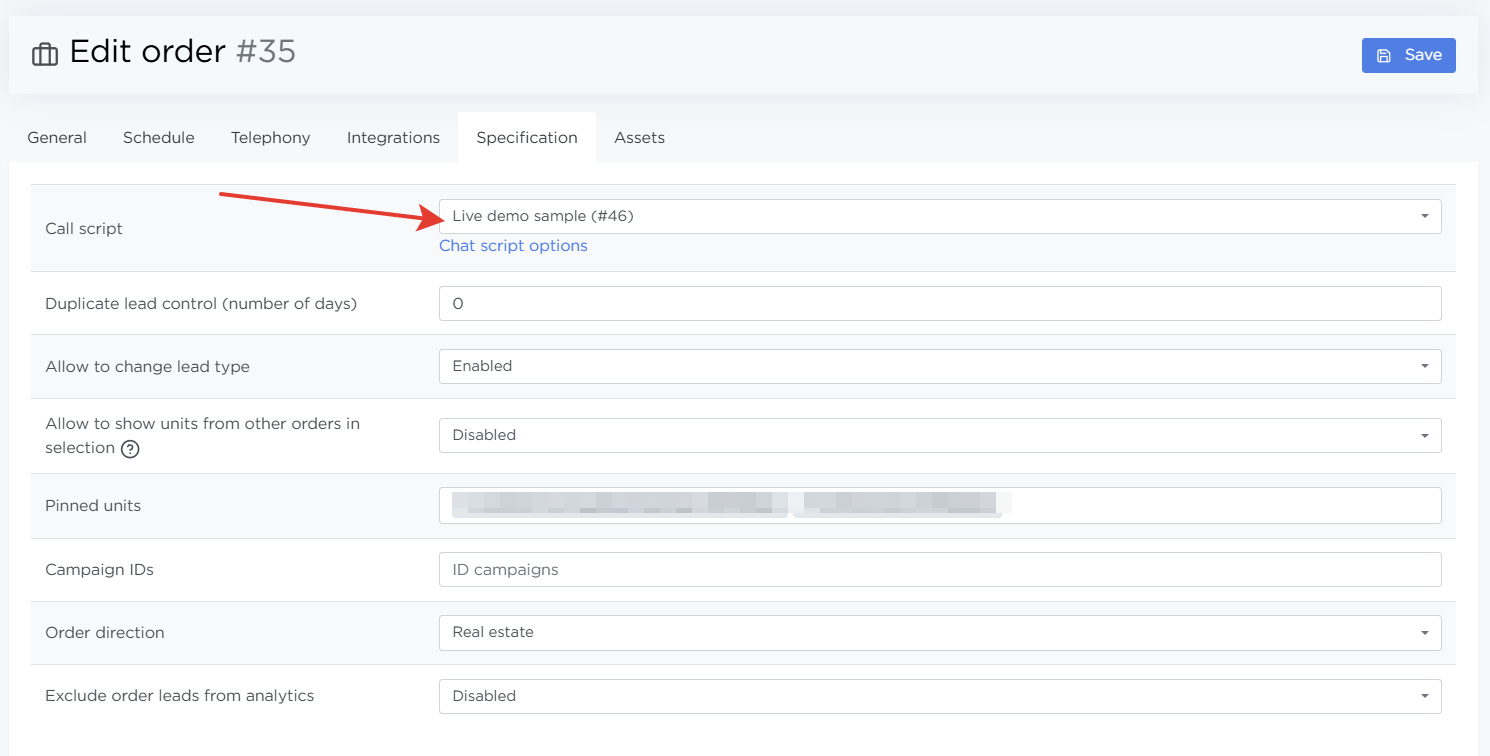 A call script is selected in the order settings under Specification → Call Script. Once selected, agents will see this script when handling leads for that order.