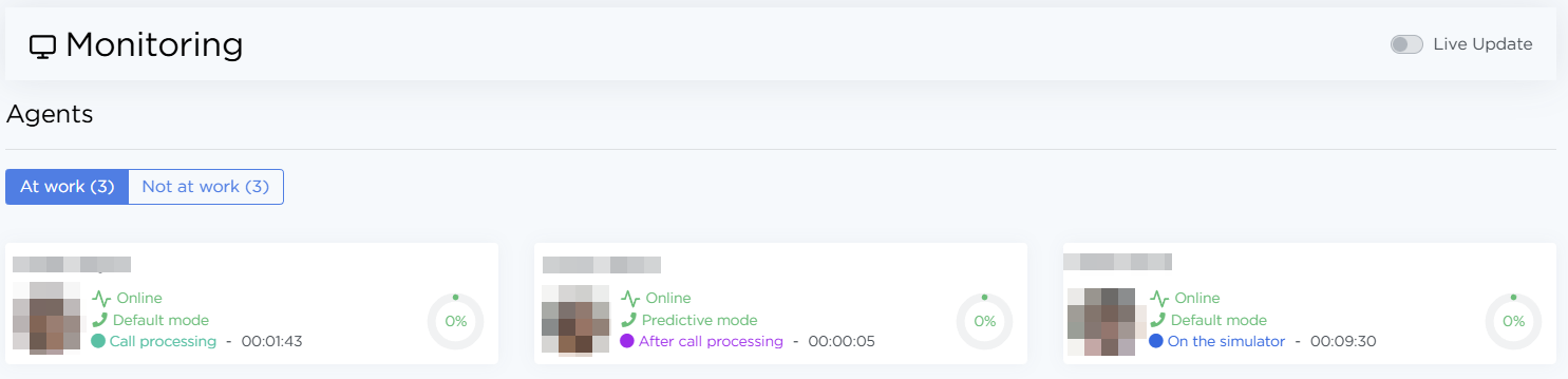 At the top of the page, there’s a list of all agents split into two tabs: At work and Not at work. Each agent card shows their status, call handling mode, what they’re currently doing (call in progress, after-call work, break, etc.) and for how long, plus their workload percentage.