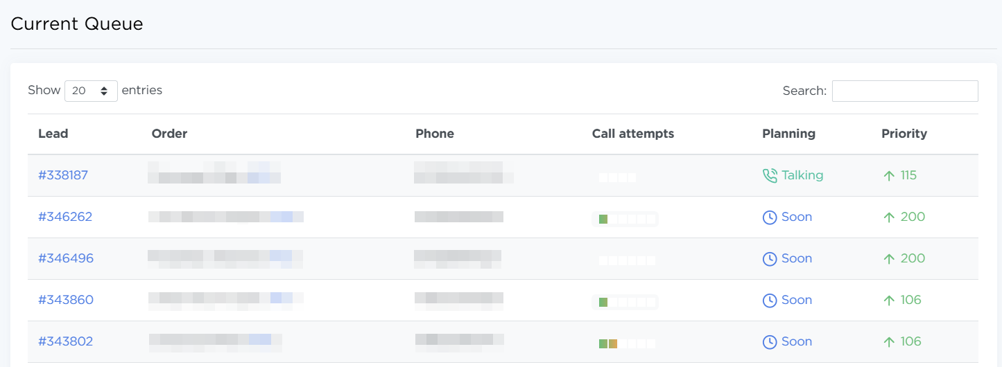 The list includes the lead ID, the order name and ID, the lead phone number, Call Attempts, Planning (current dialing state: Talking, Soon, etc.), and Priority.