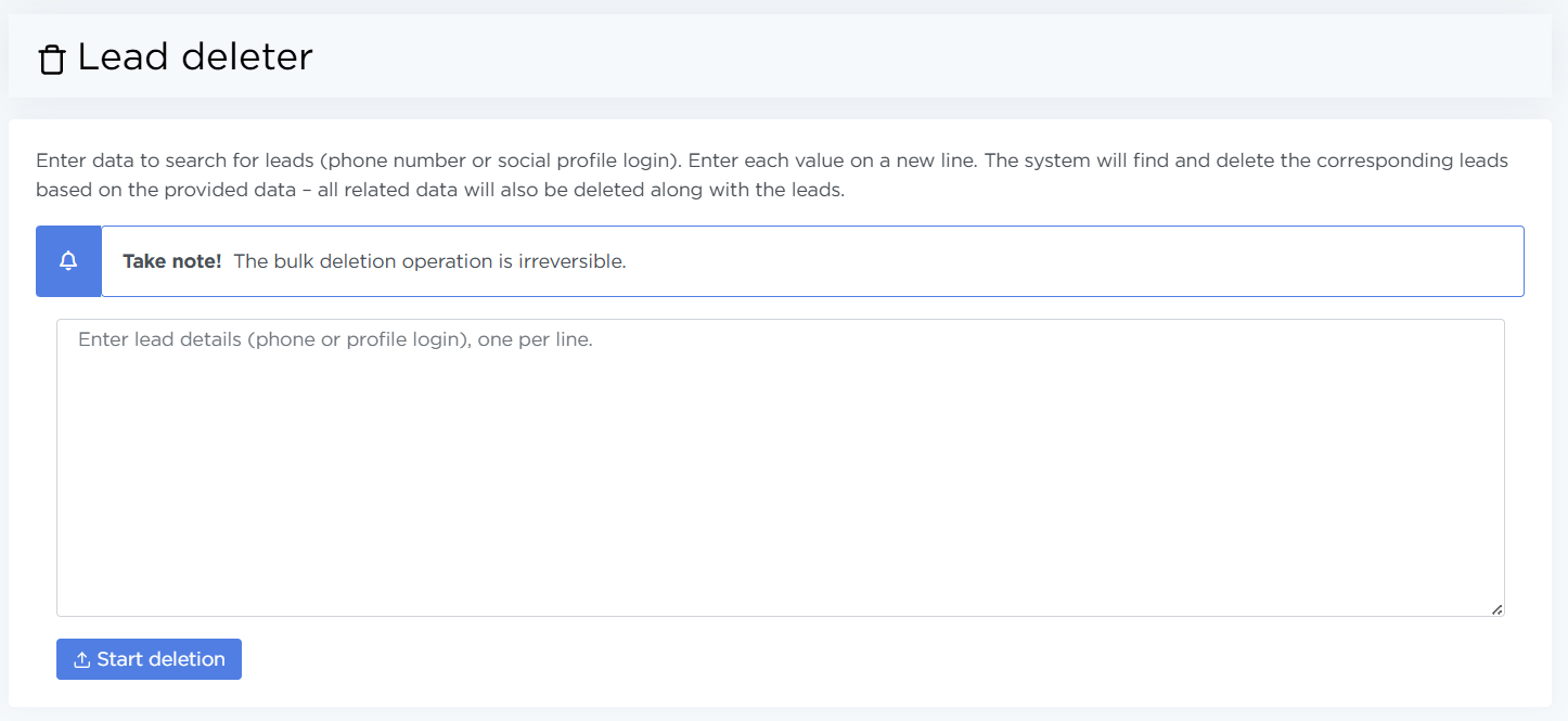 - Deleting leads affects statistics and analytics. Do not use this tool for day-to-day operations — it is intended strictly for data administration.