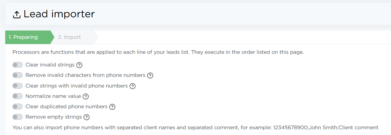 On the import page, leads are created from a list of phone numbers. Use the import tool when you need to process: