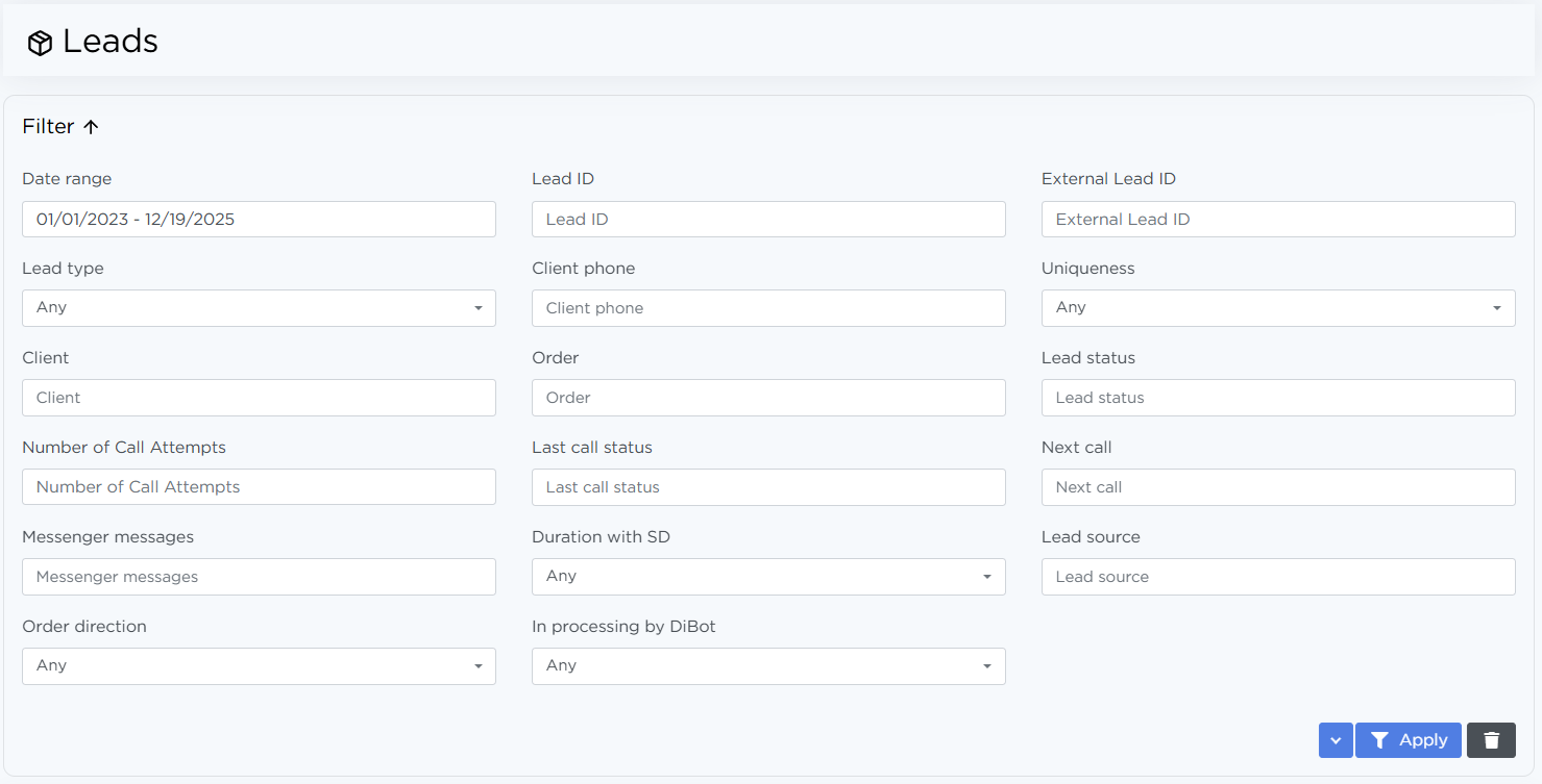 At the top of the page, there is a filters panel. It helps quickly narrow down the list of leads using the parameters you need.