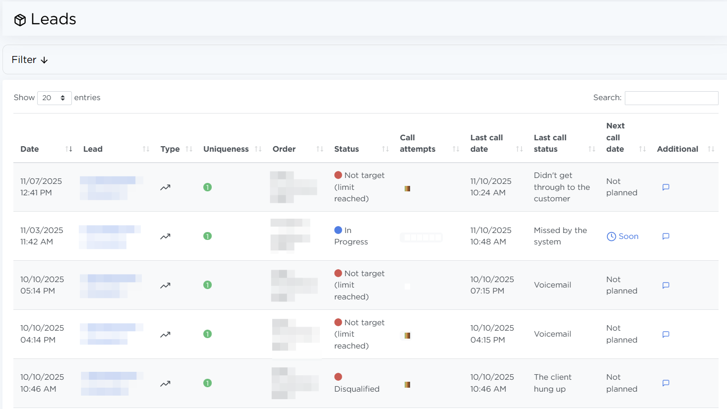 The Leads section is used to work with all incoming customer requests in Liner. Here you can find a specific lead, check its status, see how it was handled, and open the full lead card with all details.