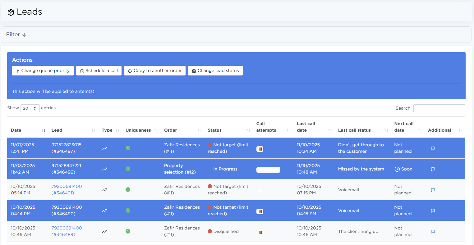 When you click a row, a quick actions panel appears. Hold Ctrl to select multiple leads, or hold Shift to select a range. You can then apply actions to all selected leads at once. Available actions include: