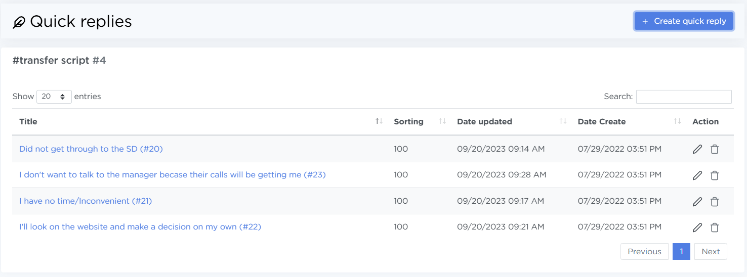 The Parametres → Quick Replies section is used to create and manage pre-written responses that agents can use during conversations with customers. Quick replies help keep communication consistent, respond to questions faster, and avoid duplicating the same wording across different scripts.