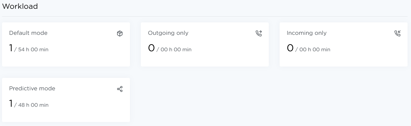 The cards show which dialing modes the selected operators work in, and the total workload for the selected period in each mode.