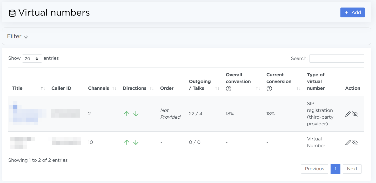 Add new virtual numbers using the Add button. More about adding numbers is available on the 👉 Quick start page.