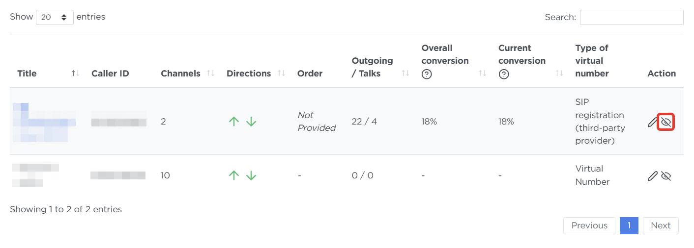 - Disabled — shows numbers that can’t receive inbound calls