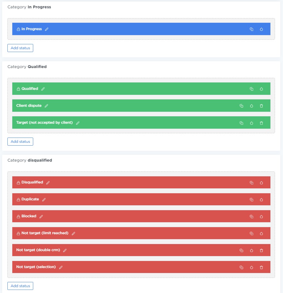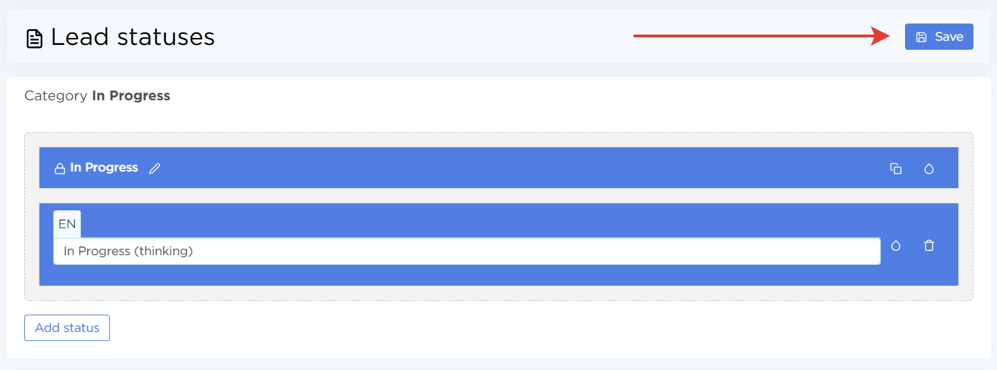 Click Add status inside the desired category: In progress / Qualified / Disqualified.