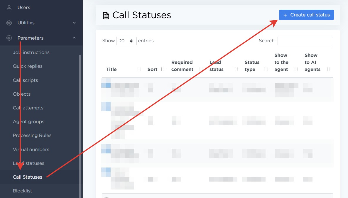 Go to Parameters → Call statuses.