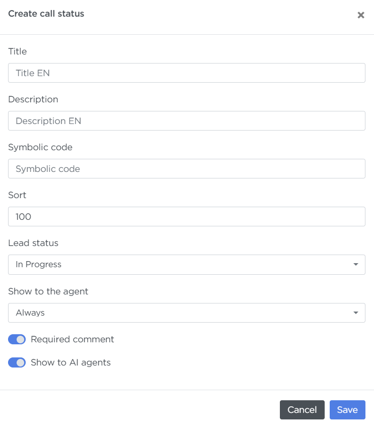 - Lead status — select the lead status that should be linked to this call status. When this call status is chosen, the lead’s status will update automatically to the value specified here. 👉 More about call statuses and lead statuses