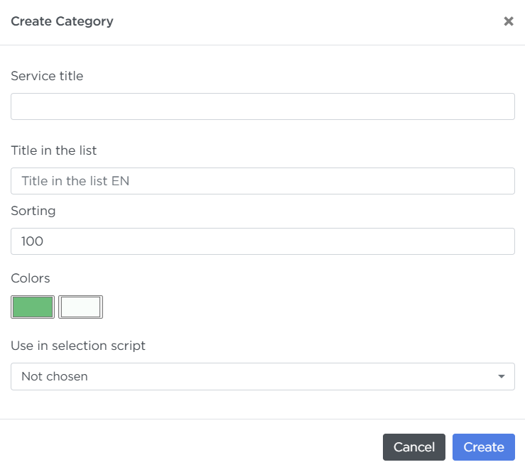 Sorting — a number that defines the order of this category in the script. Higher numbers move the category closer to the top.