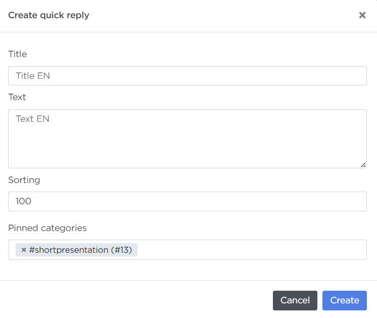 Open the category you just created and click Create quick reply. In the form, specify: