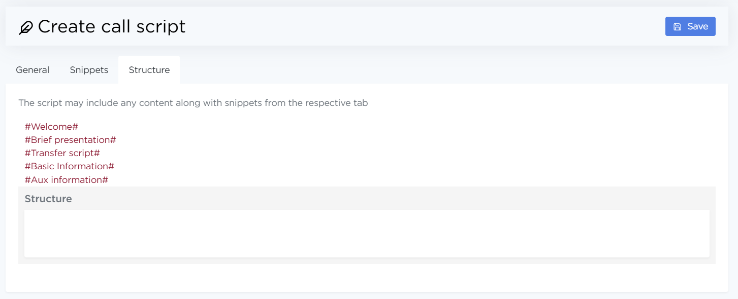 On the Snippets tab, fill in the initial phrases for each stage of the dialogue (Welcome, Brief presentation, etc.). For every block, select the quick reply categories that should appear to the operator during the call.