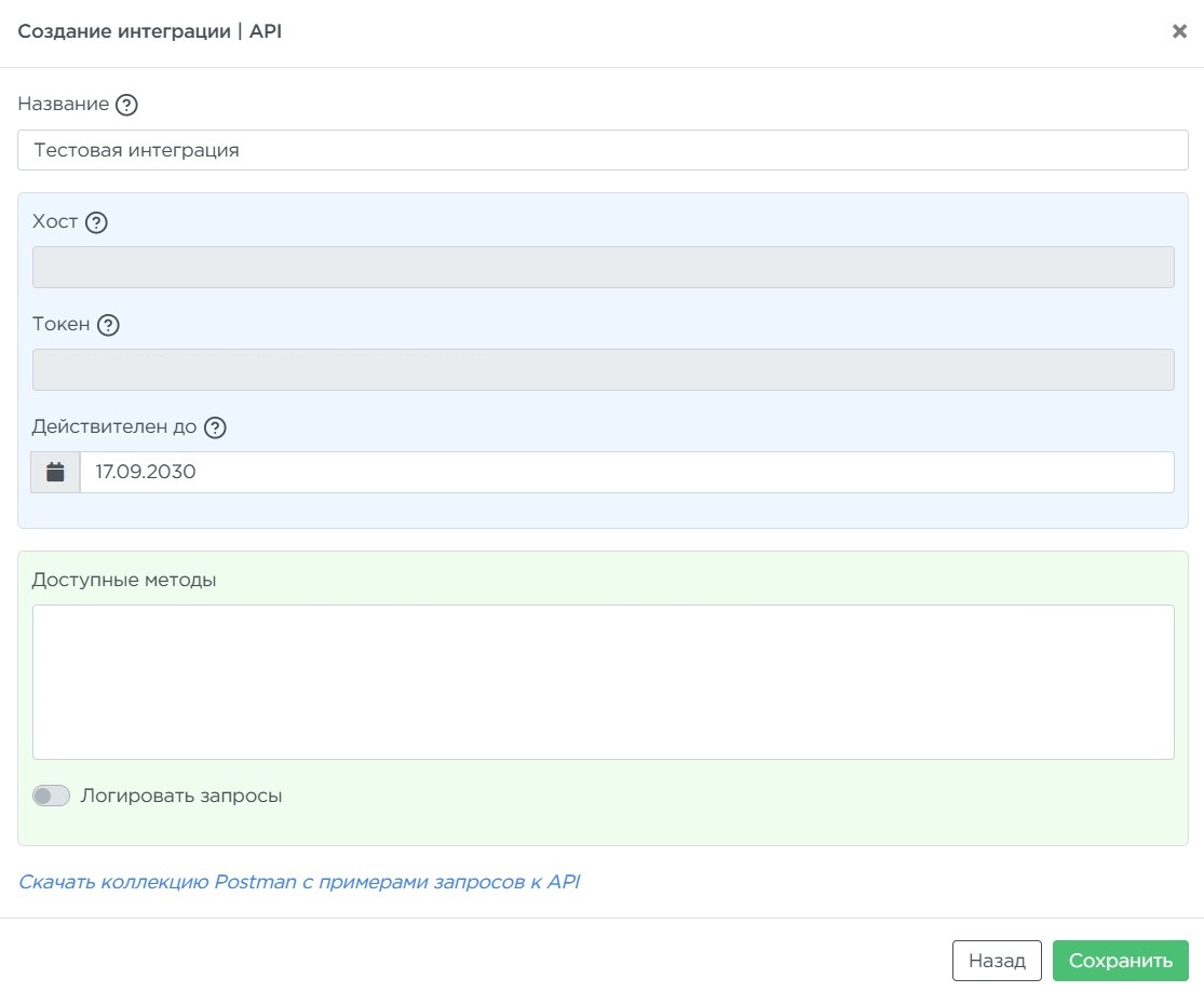 Логирование запросов — включите ползунок, если требуется сохранять историю обращений к API.