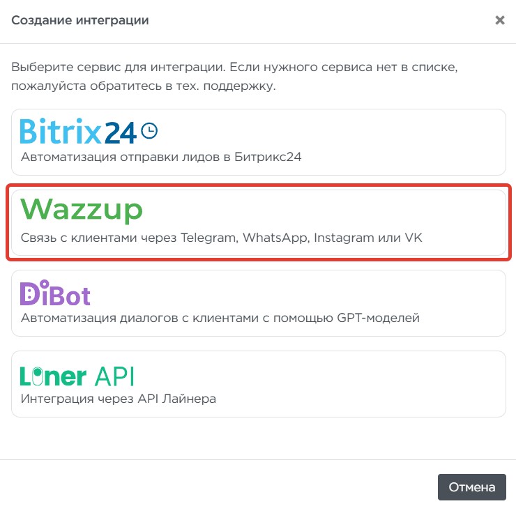 Интеграция с Wazzup позволяет использовать встроенный мессенджер Liner для общения с клиентами через WhatsApp и Telegram. После подключения операторы смогут принимать и отправлять сообщения прямо в интерфейсе Лайнера.