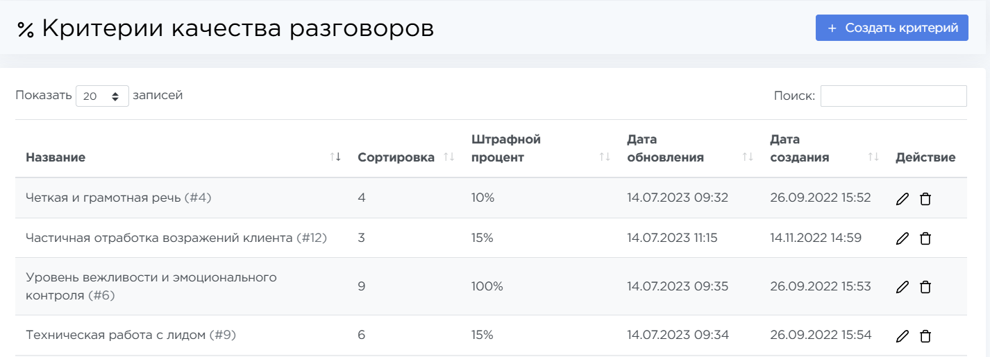 Раздел Параметры → Критерии качества разговоров предназначен для управления списком критериев, по которым модераторы оценивают звонки. На странице настраиваются сами критерии (названия, порядок и штрафной процент, а не результаты проверок.