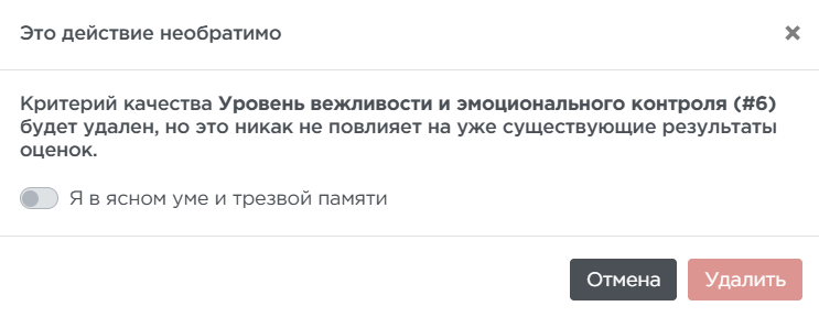 При удалении критерий исчезает из списка, но остаётся в уже сохранённых результатах оценок.