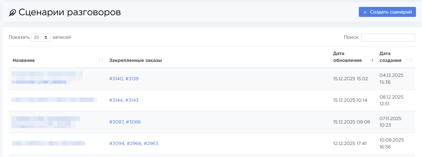 Сценарий разговора — это структура подсказок и текстов, которые оператор видит во время звонка. Один сценарий может использоваться сразу в нескольких заказах, поэтому нет необходимости дублировать одинаковые тексты.