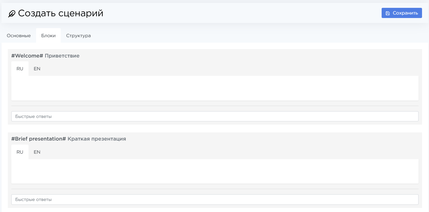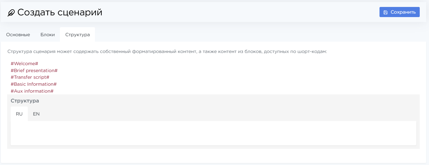 Структура. На этой вкладке расположите блоки и другой текст в нужном порядке — так сценарий будет отображаться при разговоре. Для удобства можно скопировать шорт-коды блоков с этой же страницы.