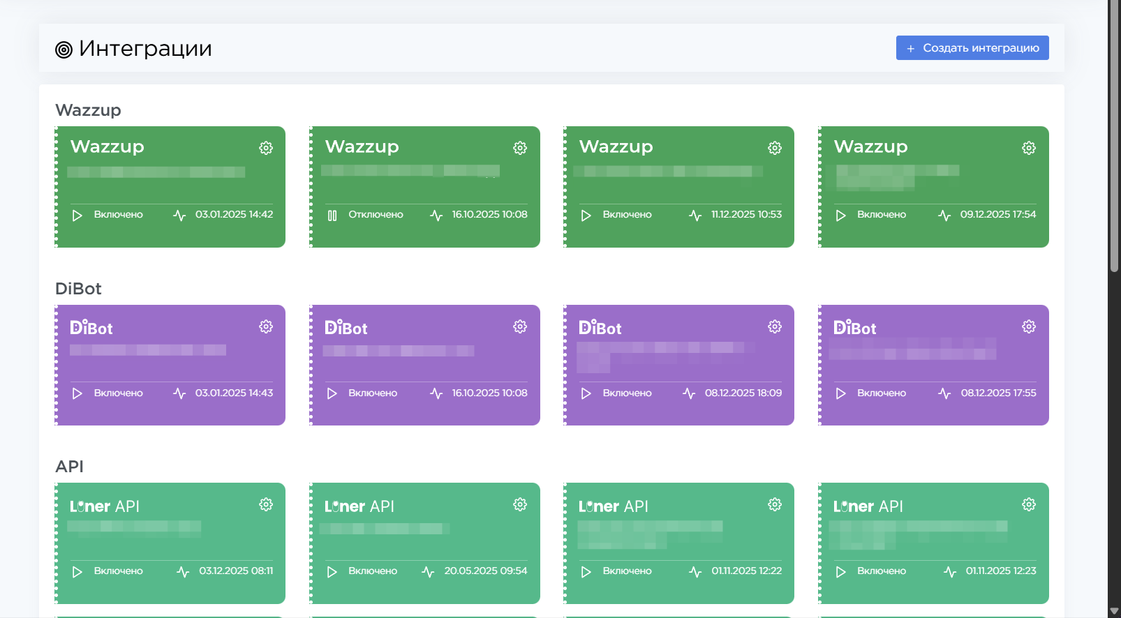 Созданные интеграции представлены в виде карточек, разделённых на сервисы. Карточка содержит краткую сводку об интеграции: