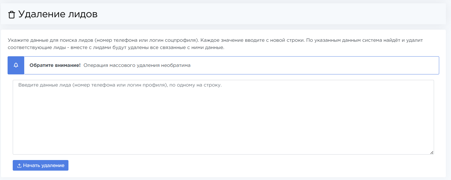Чтобы открыть страницу, перейдите в раздел Утилиты → Удаление лидов.