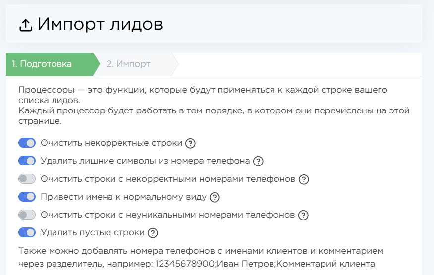Выберите процессоры, которые помогут подготовить список лидов к импорту.