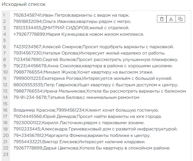 Номер телефона;Имя;Комментарий - Удалить лишние символы из номера телефона — процессор удалит дефисы, скобки и прочие символы из номеров и приведёт их к эталонному виду