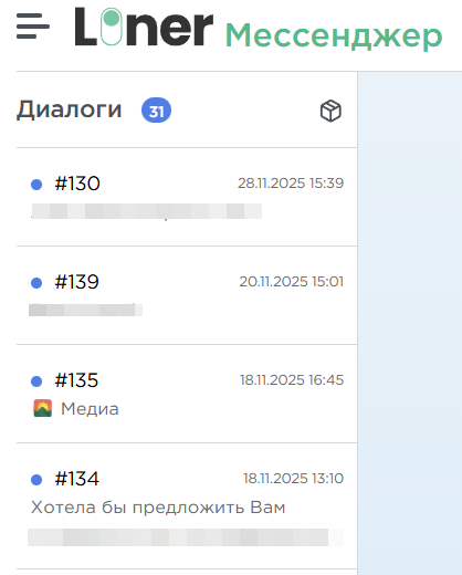 Диалоги отсортированы по актуальности — сверху отображаются последние активные переписки.
