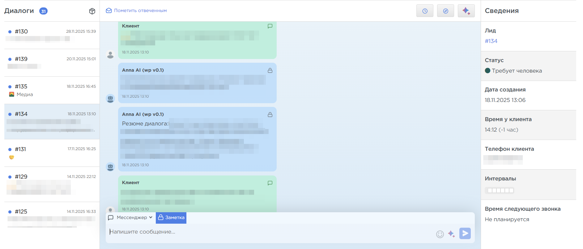 Каждый диалог связан с конкретным лидом и учитывается в общей истории взаимодействий.