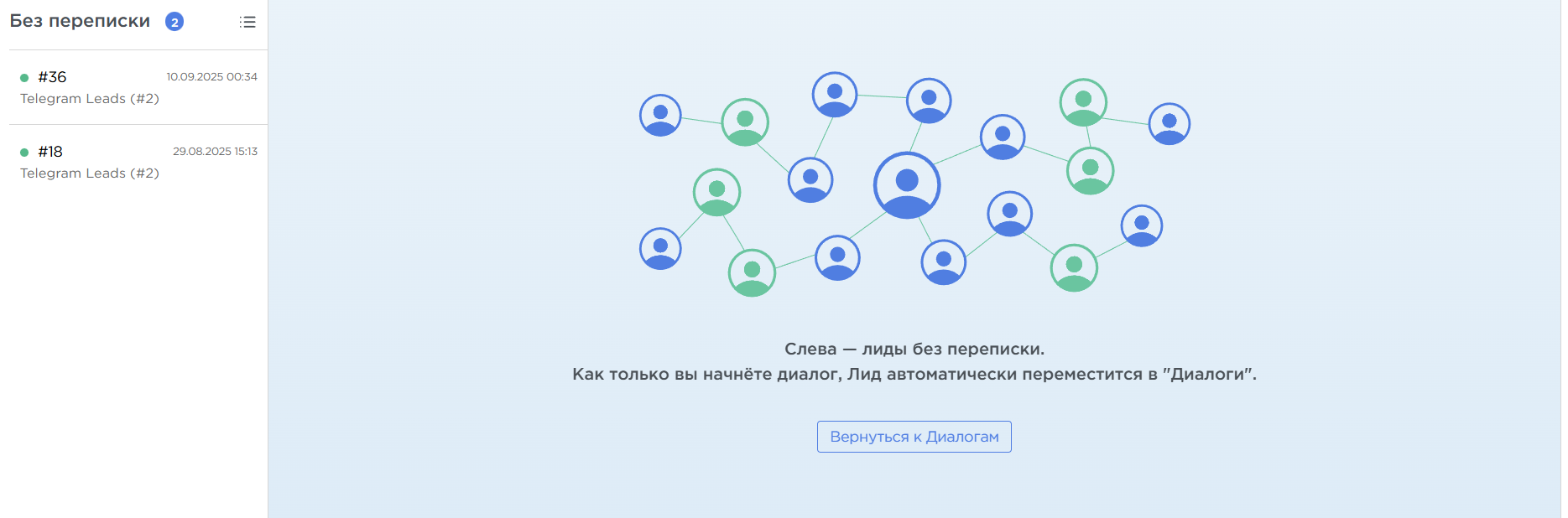 - список диалогов заменяется списком лидов, с которыми ещё не было переписки,