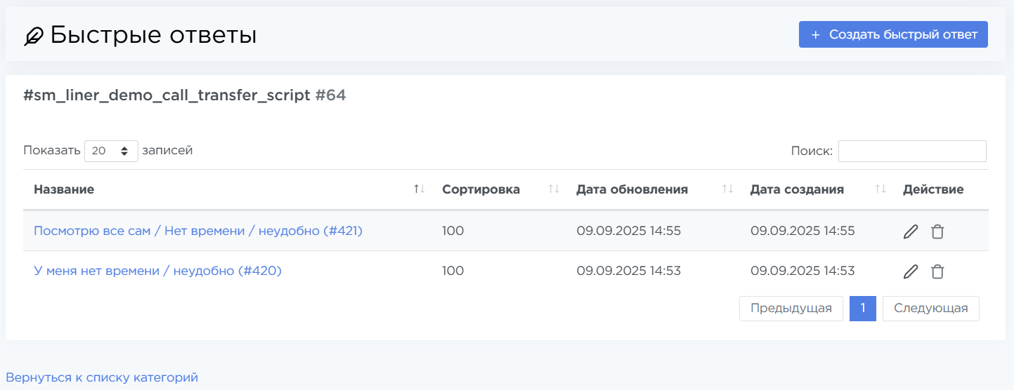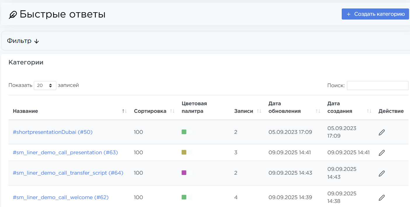 - Записи — количество быстрых ответов внутри категории,