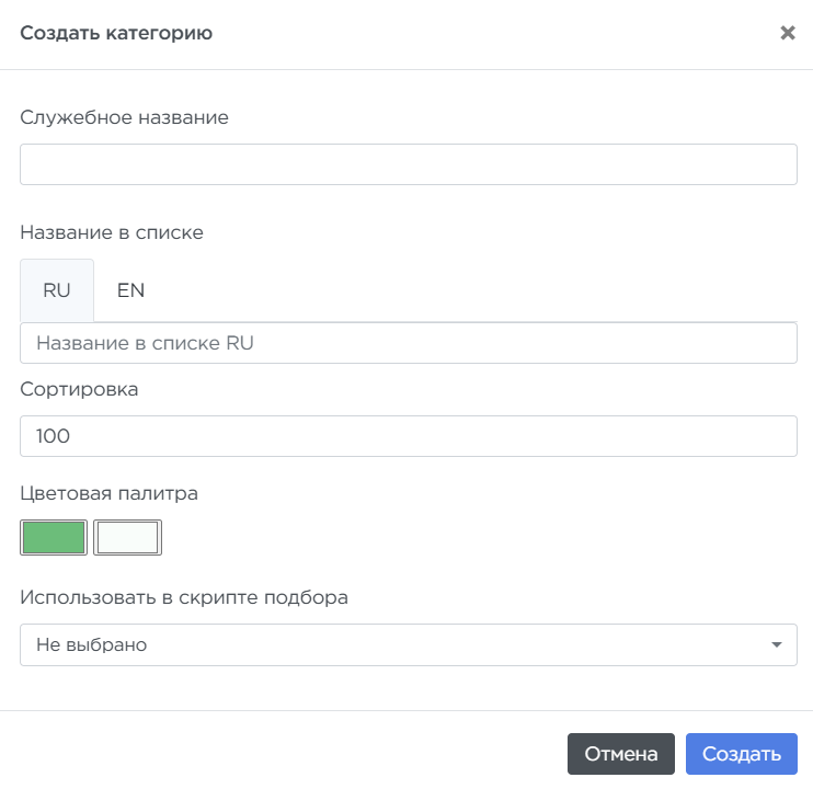 - Сортировка — порядок отображения категории в сценариях,