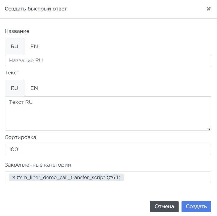 Категория — это логическая группа, которая объединяет быстрые ответы по одной теме и определяет их отображение в сценарии. Быстрый ответ — это конкретная текстовая подсказка, которую оператор использует во время разговора.
