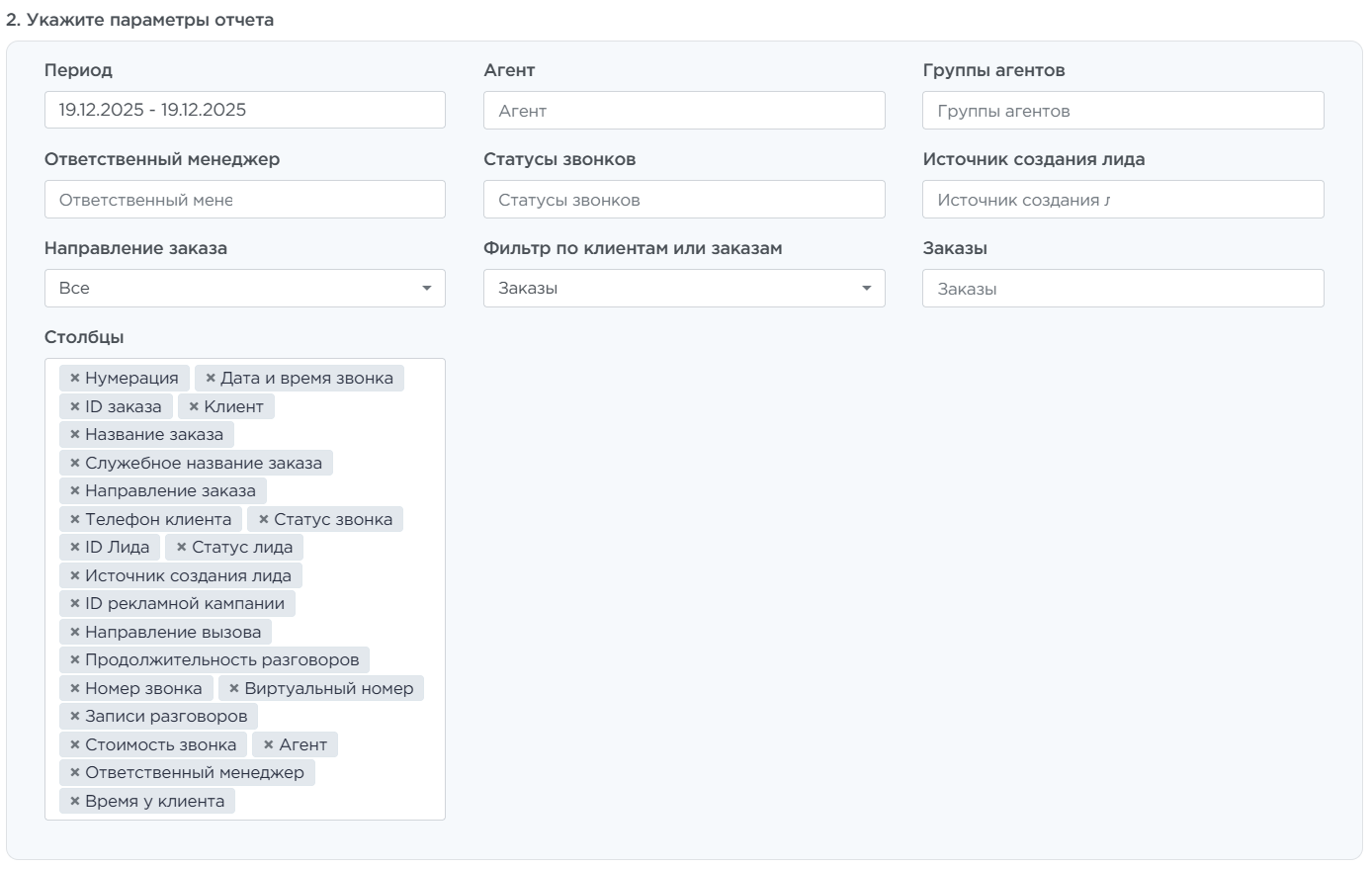 Чтобы сформировать отчёт, укажите параметры. Их набор зависит от типа отчёта, но логика работы едина.