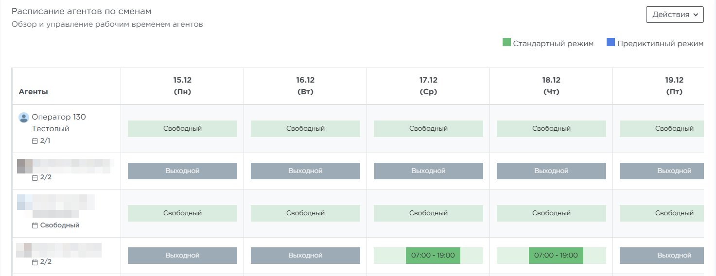 В карточках указано, в каких режимах обзвона задействованы выбранные операторы, и какая общая нагрузка за период в этих режимах.